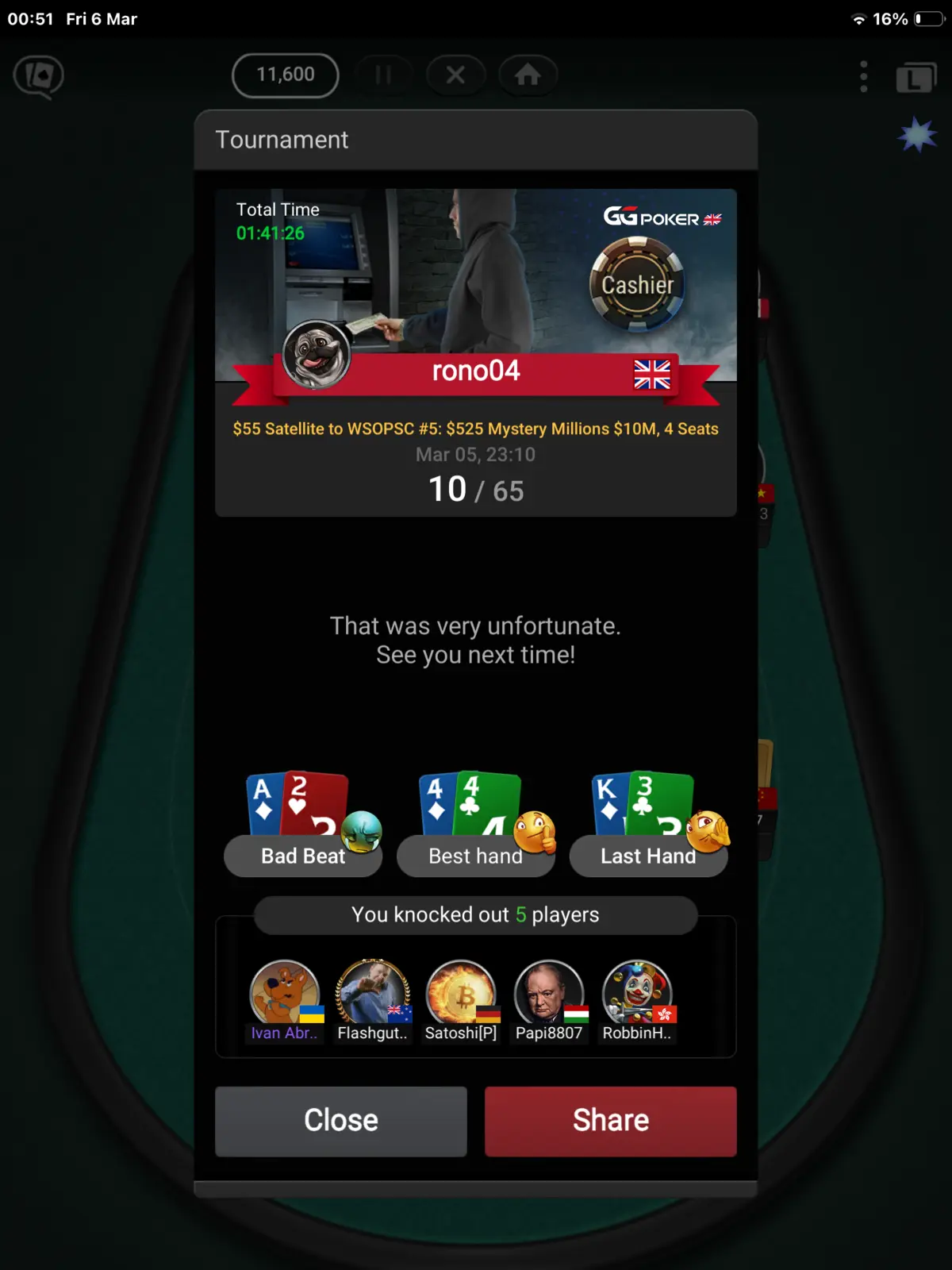 Yes Cardmates I bricked it again. I was the big stack right till the final couple of places. I must have a good enough game I just don’t seem to be able to get that final hand to get me over the line!