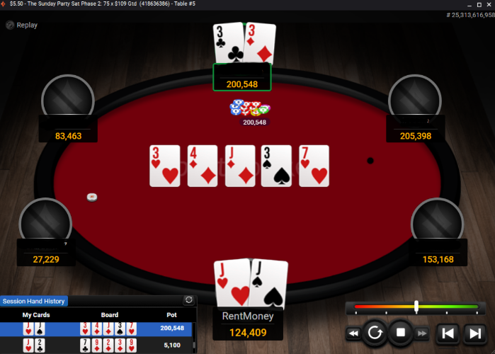 This tournament was a Phase 2 for a $109 ticket on party poker. The third phase being the final. I flop top trips and my opponent flopped bottom trips. This should be easy work right? Think again; turn comes the case three >>> Boom Quads >>>. When the turn hit my opponent bet 4200 into a 58000 pot. I paused for a second thinking to myself "That's scared money if I ever seen such a thing or quads.". I made the final regardless. I won a ticket in this very series last week. Hopefully history repeats itself. I'm short stacked this time around with just 300K in chips compared to the average stack that will end up being somewhere around 800K. But that's ok. As the saying goes, "A chip and a chair".