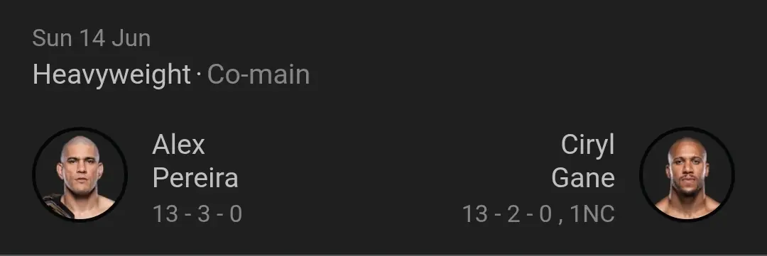 I think this will be a very good fight where both fighters bring alot to the table. I think Gane has to keep the fight at range and make it very technical in order for him to secure a points win. But I think the more likely out come it that Pereira as long as the move to heavyweight hasn't affected him in a negative way. He will have far to much power in his hands and at some point he will catch up with and knock out Gane.