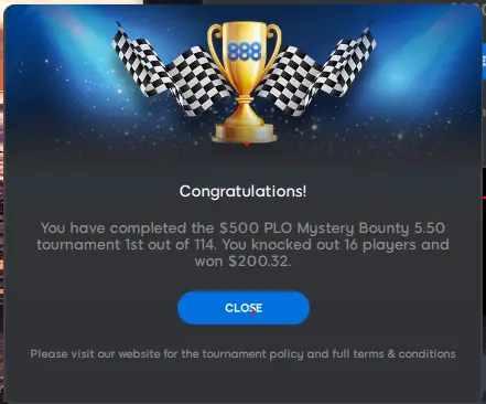 Somehow i took down the biggest bounty of $50 in that hand and then with my new found chips took the 2nd bounty of $25 - This led me to having most of the chips and being a big chip leader on my table > allowing me to bully and dominate all the way to ending up being 3 handed with one player sitting out who i ended up heads up with for the win.... it was a bit anti climactic to be honest but a nearly 40x score cant be sniffed at. I really needed this one as my 888 roll had depleted after a recent heft withdrawal and a period of run bad + playing over my bankroll limits. Hopefully i can run up this $200 into 2K then 200K?!